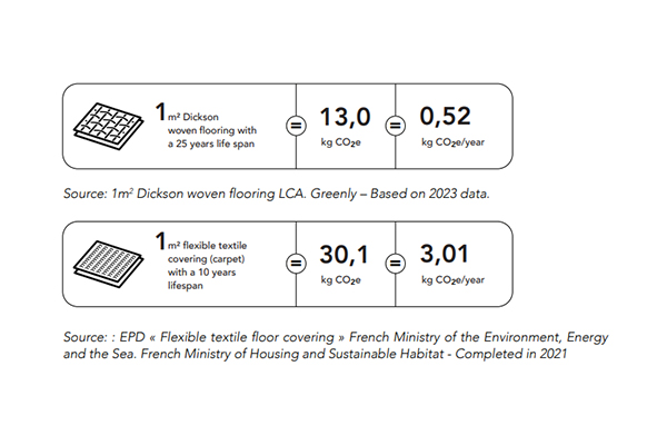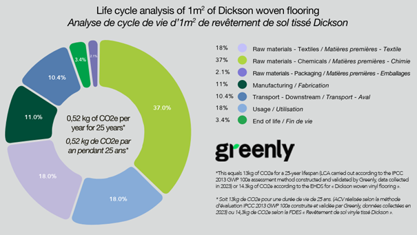 The LCA, conducted by Greenly, an independent specialized organization, shows that 1 m² of Dickson woven flooring emits 13 kg CO₂e over a 25-year lifespan, which equals 0.52 kg CO₂e per year.